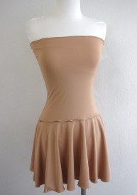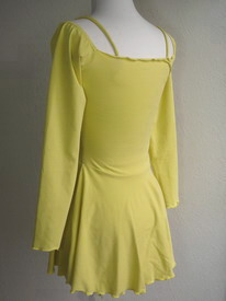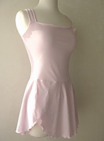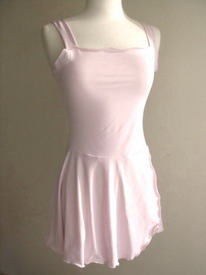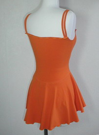 #5006 ワイドストラップオーバースカート前スリットタイプ ¥5,200薄手Tシャツ地の他の色は、色、生地見本からお選び下さい。 安定感のある太いストラップ。胸元、裾はメロウ仕上げでかわいらしく。 淡いオレンジで、いろんな色のレオタードに合わせやすいです。 | ||